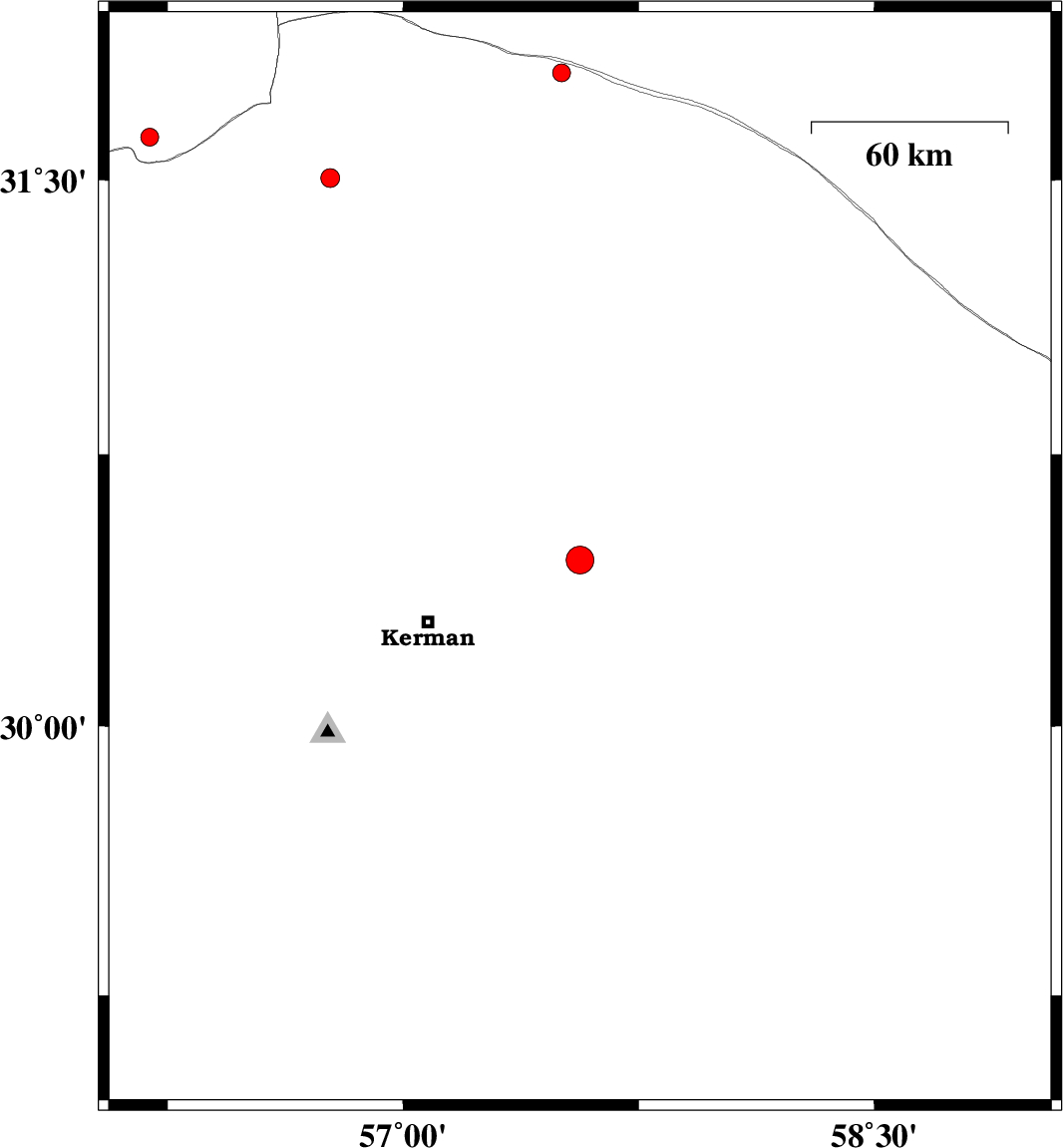 | 2016/04/05 | 04:08:00.2 | 08:38:00.2 | 30.459 | 57.563 | 14 | ML3.9 | Kerman Province, 50 km North-East of Kerman | ||