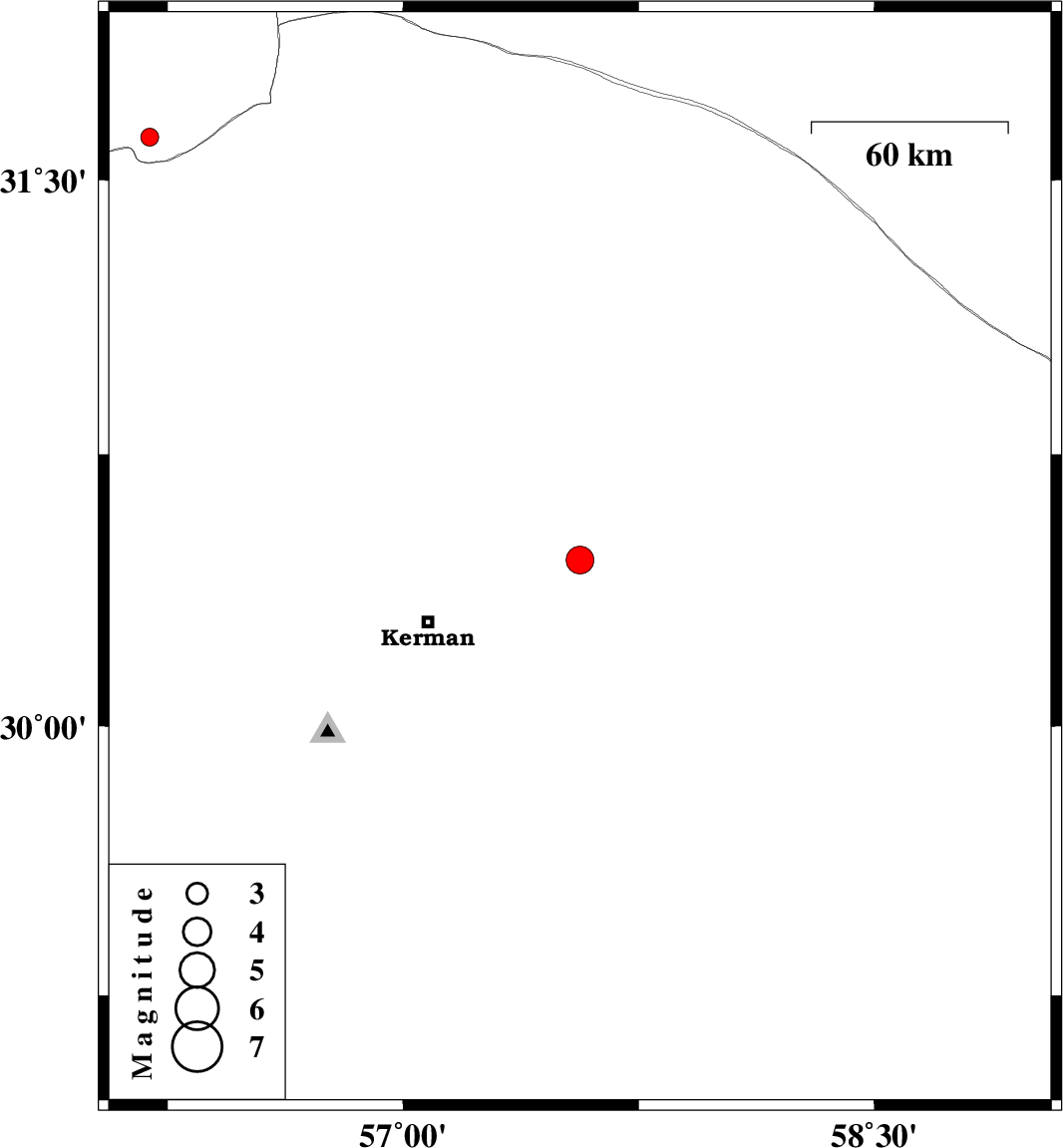 | 2016/04/05 | 04:08:00.2 | 08:38:00.2 | 30.459 | 57.563 | 14 | ML3.9 | Kerman Province, 50 km North-East of Kerman | ||