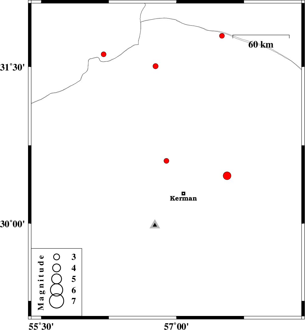 | 2016/04/05 | 04:08:00.2 | 08:38:00.2 | 30.459 | 57.563 | 14 | ML3.9 | Kerman Province, 50 km North-East of Kerman | ||