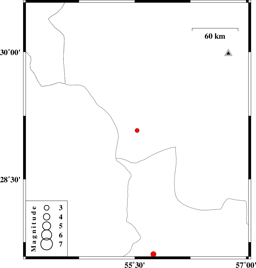 | 2016/03/19 | 10:29:46.0 | 13:59:46.0 | 29.077 | 55.532 | 14 | ML2.5 | Kerman Province, 43 km South-West of Sirjan | ||
