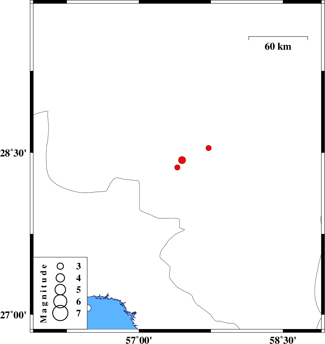 | 2016/04/28 | 09:15:39.9 | 13:45:39.9 | 28.543 | 57.725 | 14 | ML2.5 | Kerman Province, 14 km South of Jiroft | ||