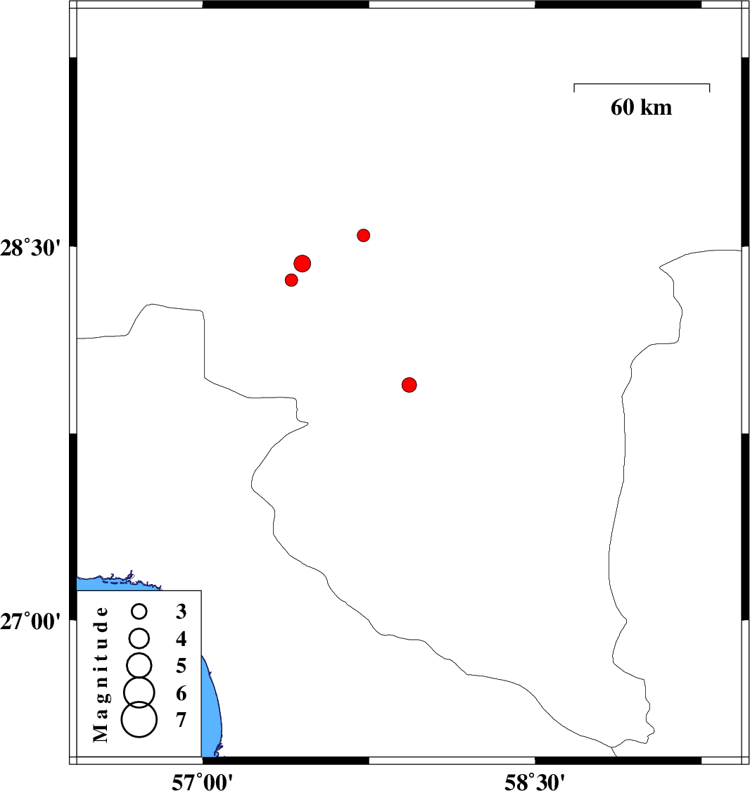 | 2016/04/28 | 09:15:39.9 | 13:45:39.9 | 28.543 | 57.725 | 14 | ML2.5 | Kerman Province, 14 km South of Jiroft | ||