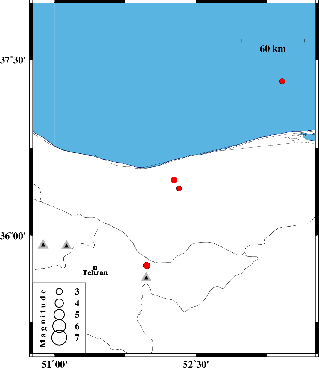 | 2016/04/14 | 01:58:05.1 | 06:28:05.1 | 37.316 | 53.415 | 14 | ML2.6 | Caspian Sea, 70 km North-West of Behshahr |