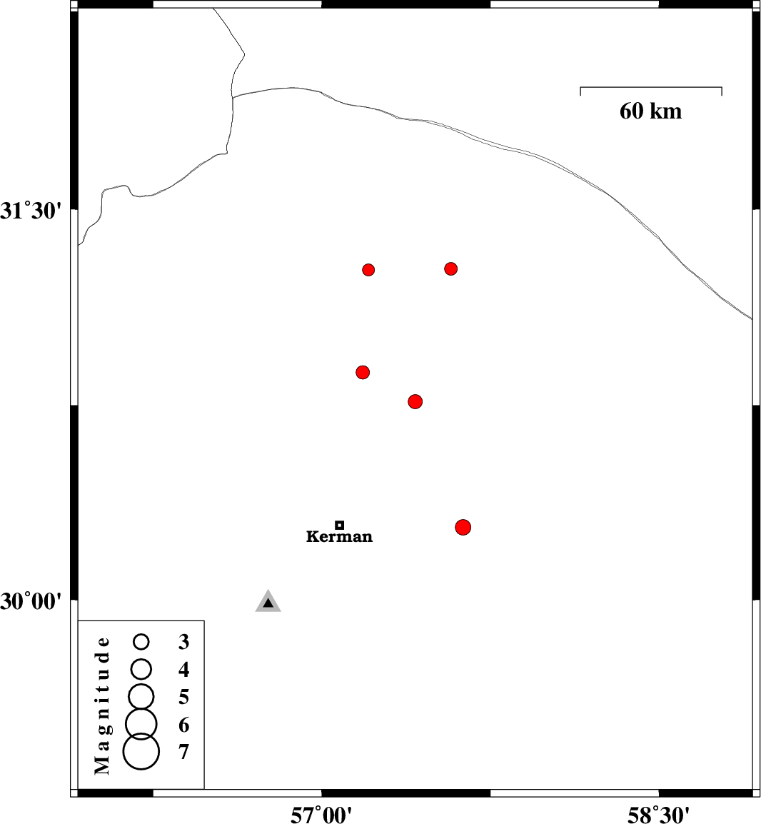 | 2016/05/13 | 10:54:55.6 | 15:24:55.6 | 30.763 | 57.415 | 14 | ML2.8 | Kerman Province, 62 km North-East of Kerman | ||