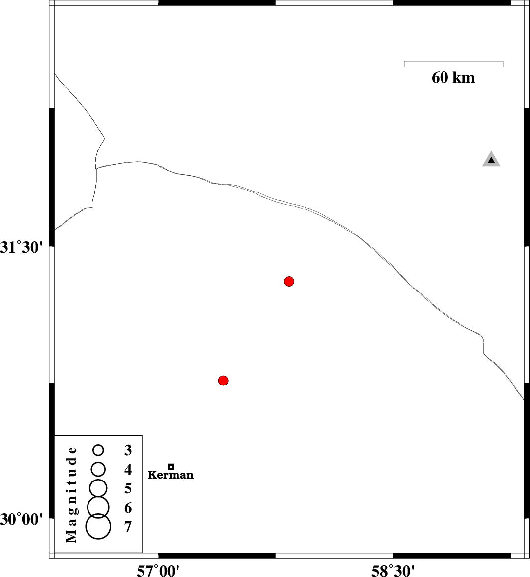 | 2016/05/13 | 10:54:55.6 | 15:24:55.6 | 30.763 | 57.415 | 14 | ML2.8 | Kerman Province, 62 km North-East of Kerman |