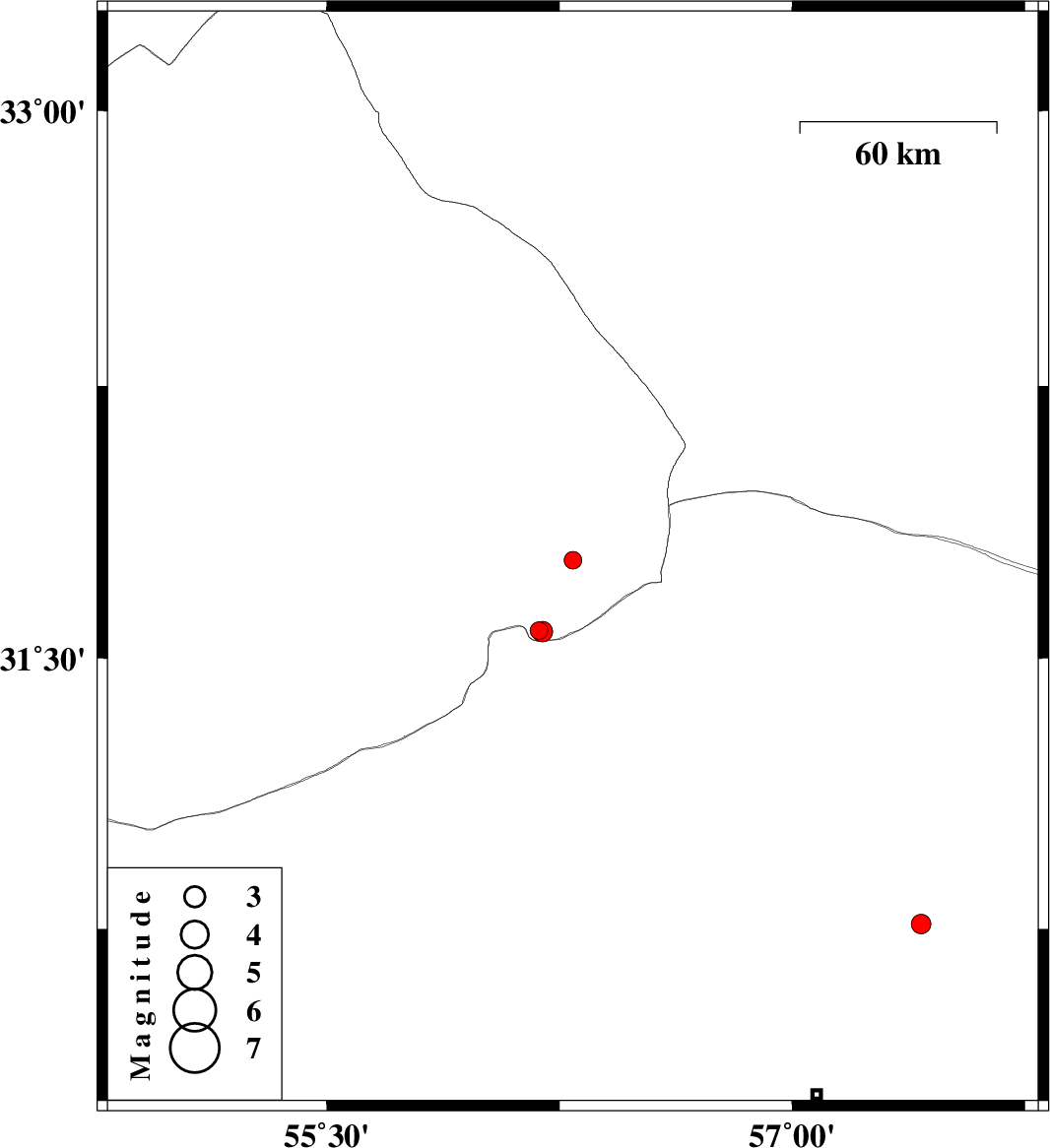 | 2016/05/13 | 10:54:55.6 | 15:24:55.6 | 30.763 | 57.415 | 14 | ML2.8 | Kerman Province, 62 km North-East of Kerman |
