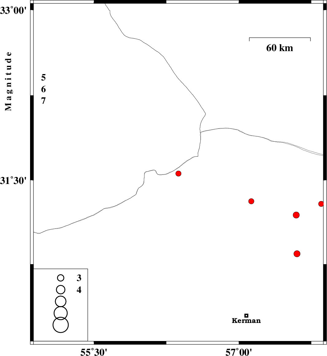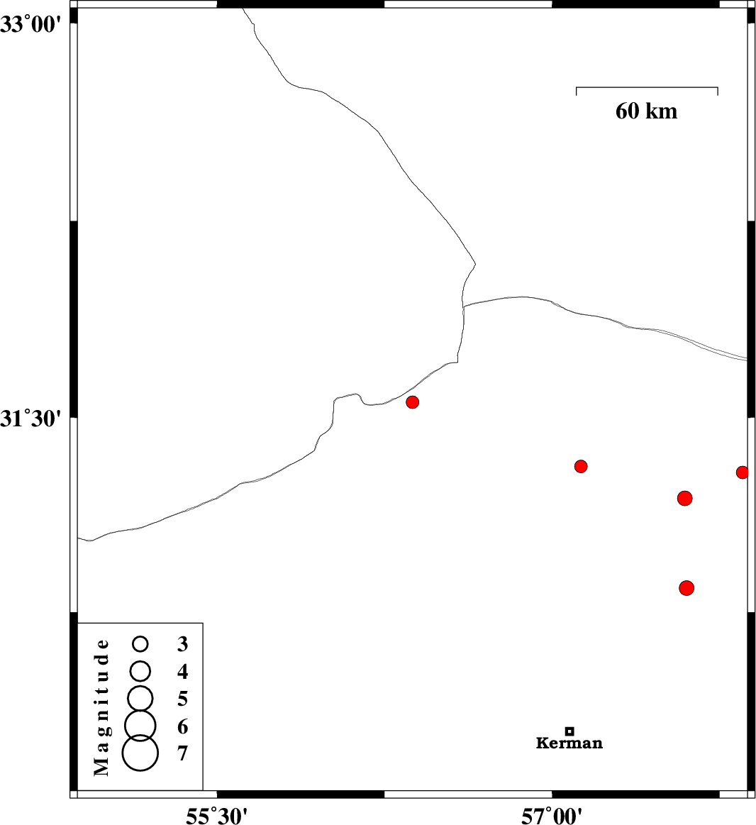 | 2016/05/25 | 03:28:53.4 | 07:58:53.4 | 30.843 | 57.603 | 14 | ML2.9 | Kerman Province, 99 km -East of Zarand | ||