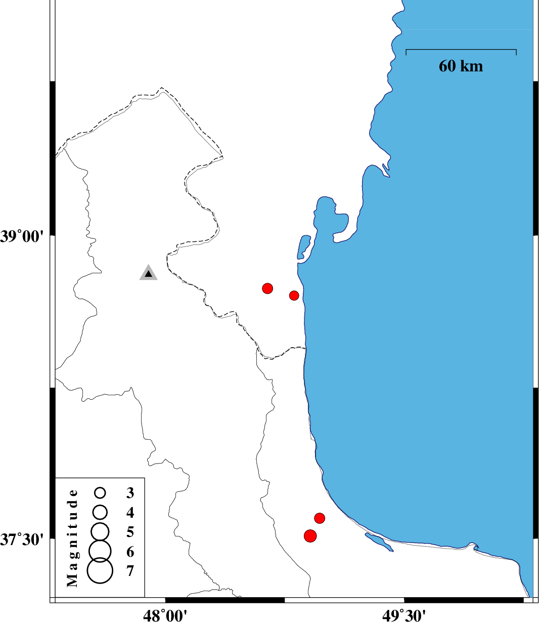 | 2016/05/23 | 06:04:57.7 | 10:34:57.7 | 37.513 | 48.91 | 15 | ML3.5 | Gilan Province, 22 km -West of Rezvanshahr |