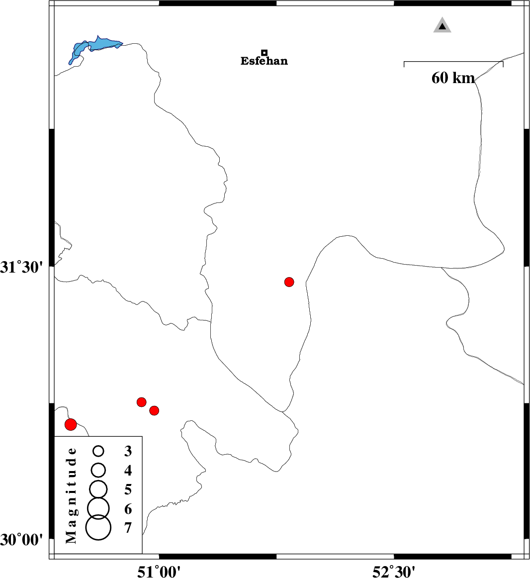 | 2016/06/10 | 19:12:32.5 | 23:42:32.5 | 31.415 | 51.83 | 14 | ML2.7 | Esfahan Province, 24 km -East of Semirom | ||