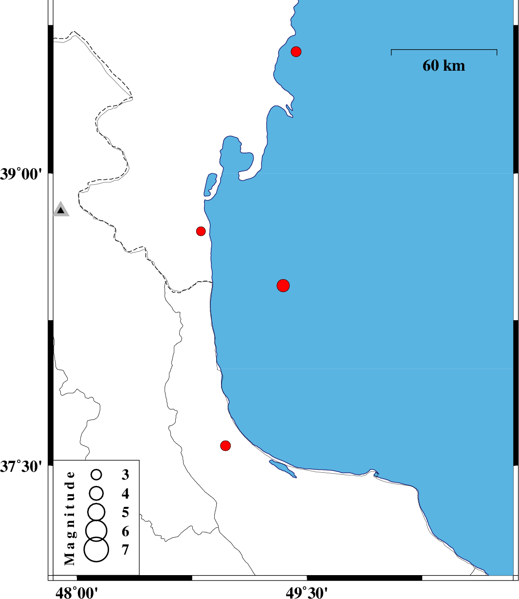 | 2016/06/12 | 16:48:40.4 | 21:18:40.4 | 38.427 | 49.344 | 14 | ML3.6 | Caspian Sea, 42 km -East of Astara | ||