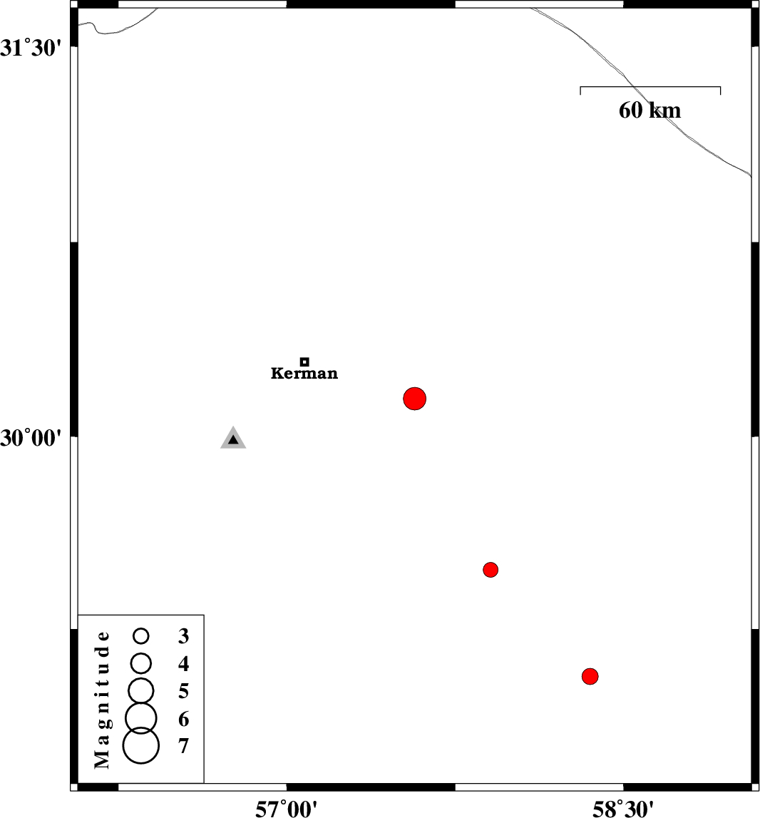 | 2016/06/11 | 18:33:39.9 | 23:03:39.9 | 29.482 | 57.907 | 14 | ML2.9 | Kerman Province, 60 km North-West of Bam |