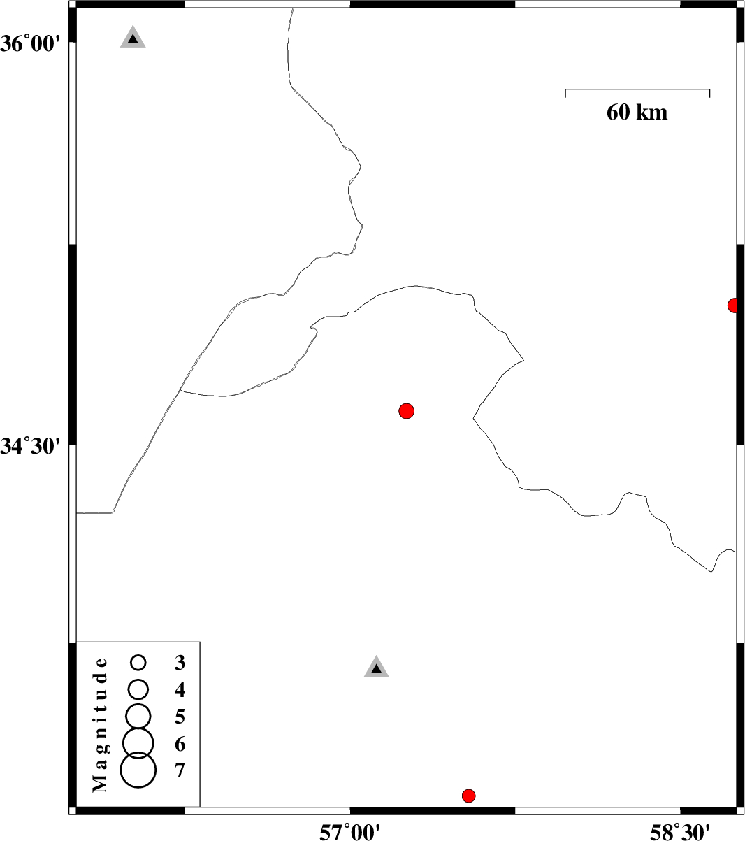 | 2016/06/03 | 01:58:03.3 | 06:28:03.3 | 33.169 | 57.538 | 14 | ML2.7 | Yazd Province, 74 km South-East of Tabas | ||