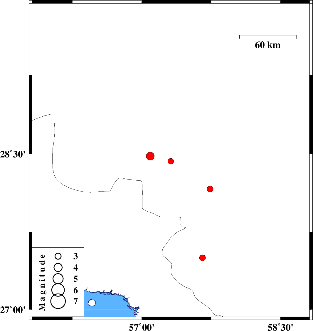 | 2016/06/26 | 05:28:25.4 | 09:58:25.4 | 27.499 | 57.657 | 14 | ML2.9 | Kerman Province, 19 km -East of Manujan |