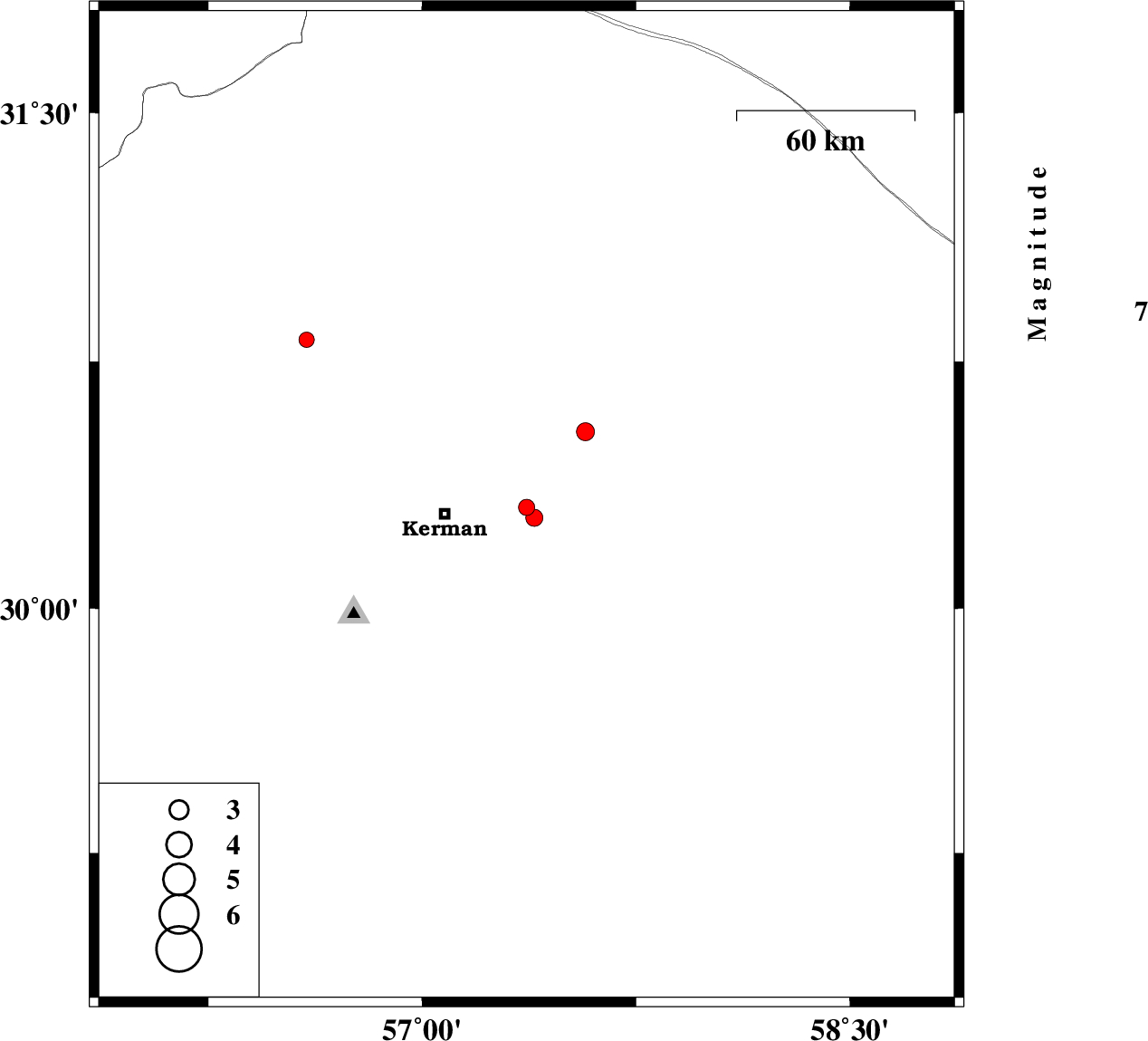 | 2016/06/30 | 00:41:39.2 | 05:11:39.2 | 30.307 | 57.366 | 14 | ML2.6 | Kerman Province, 28 km -East of Kerman | ||