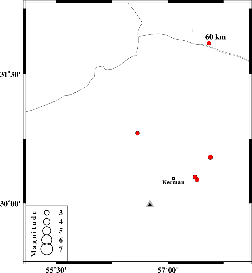 | 2016/06/30 | 00:41:39.2 | 05:11:39.2 | 30.307 | 57.366 | 14 | ML2.6 | Kerman Province, 28 km -East of Kerman | ||