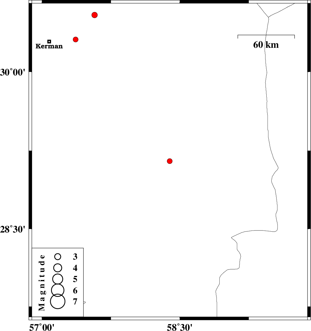 | 2016/06/30 | 00:41:39.2 | 05:11:39.2 | 30.307 | 57.366 | 14 | ML2.6 | Kerman Province, 28 km -East of Kerman |