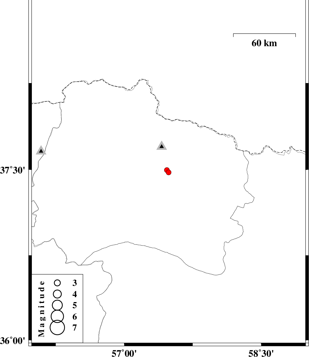 | 2016/07/10 | 22:03:40.9 | 02:33:40.9 | 37.476 | 57.486 | 14 | ML2.6 | Khorasan(north) Province, 14 km -East of Bojnurd | ||