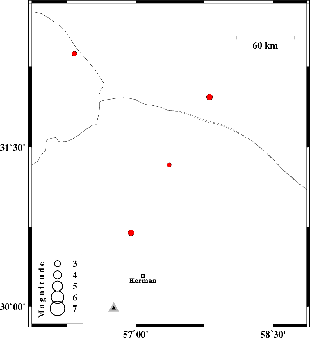 | 2016/07/19 | 22:47:40.1 | 03:17:40.1 | 30.697 | 56.95 | 14 | ML3 | Kerman Province, 39 km South-East of Zarand | ||