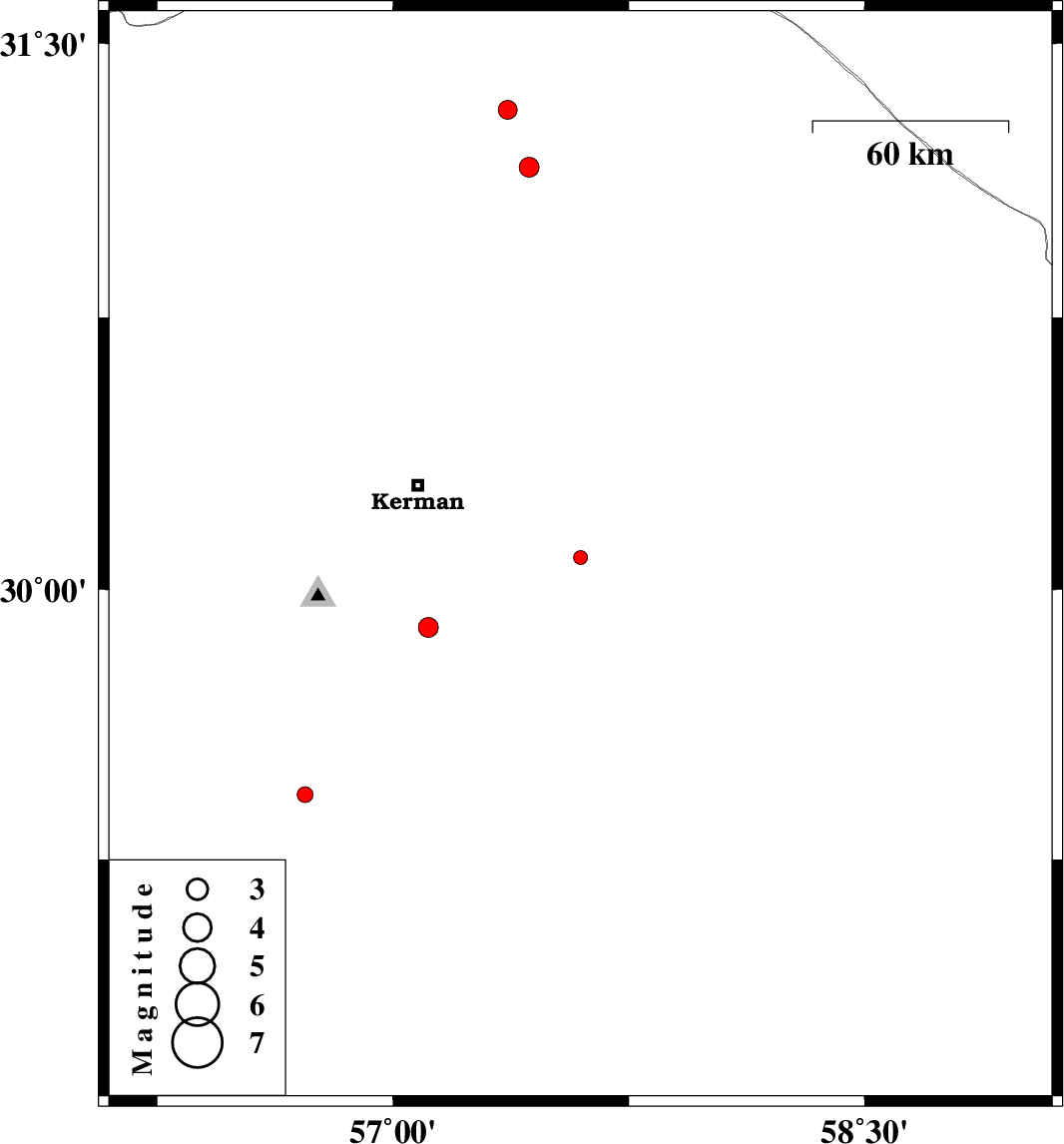 | 2016/07/22 | 02:44:47.2 | 07:14:47.2 | 29.895 | 57.112 | 14 | ML2.8 | Kerman Province, 44 km South of Kerman |