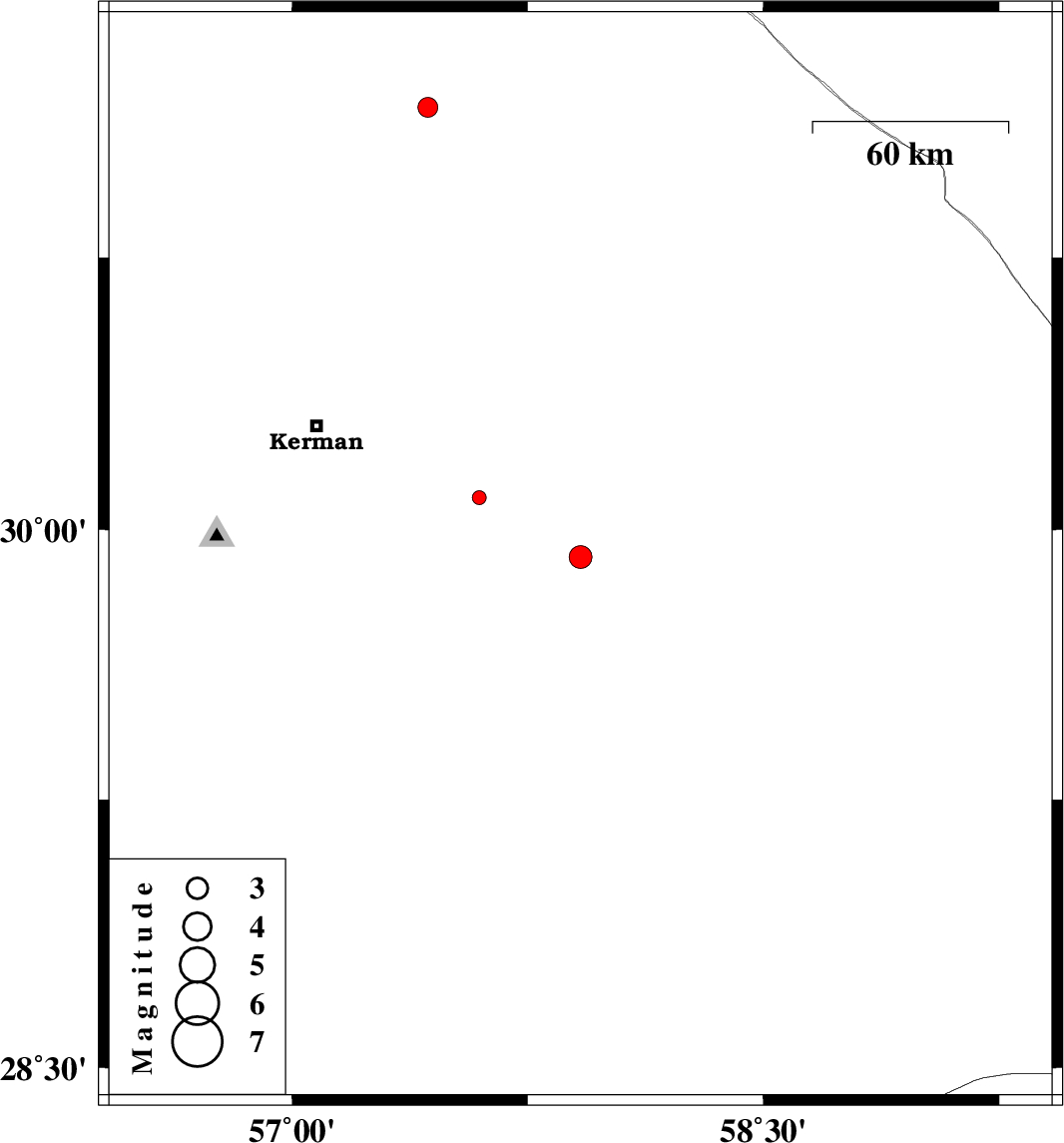 | 2016/07/29 | 12:27:01.4 | 16:57:01.4 | 30.089 | 57.596 | 14 | ML2 | Kerman Province, 54 km South-East of Kerman | ||