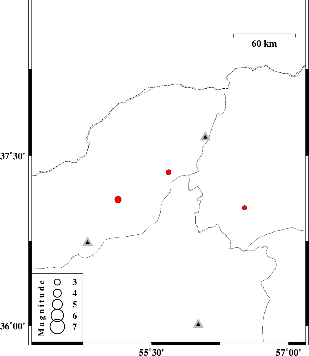 | 2016/07/30 | 04:31:57.6 | 09:01:57.6 | 37.043 | 56.519 | 8 | ML2.2 | Khorasan(north) Province, 15 km -East of Jajarm |