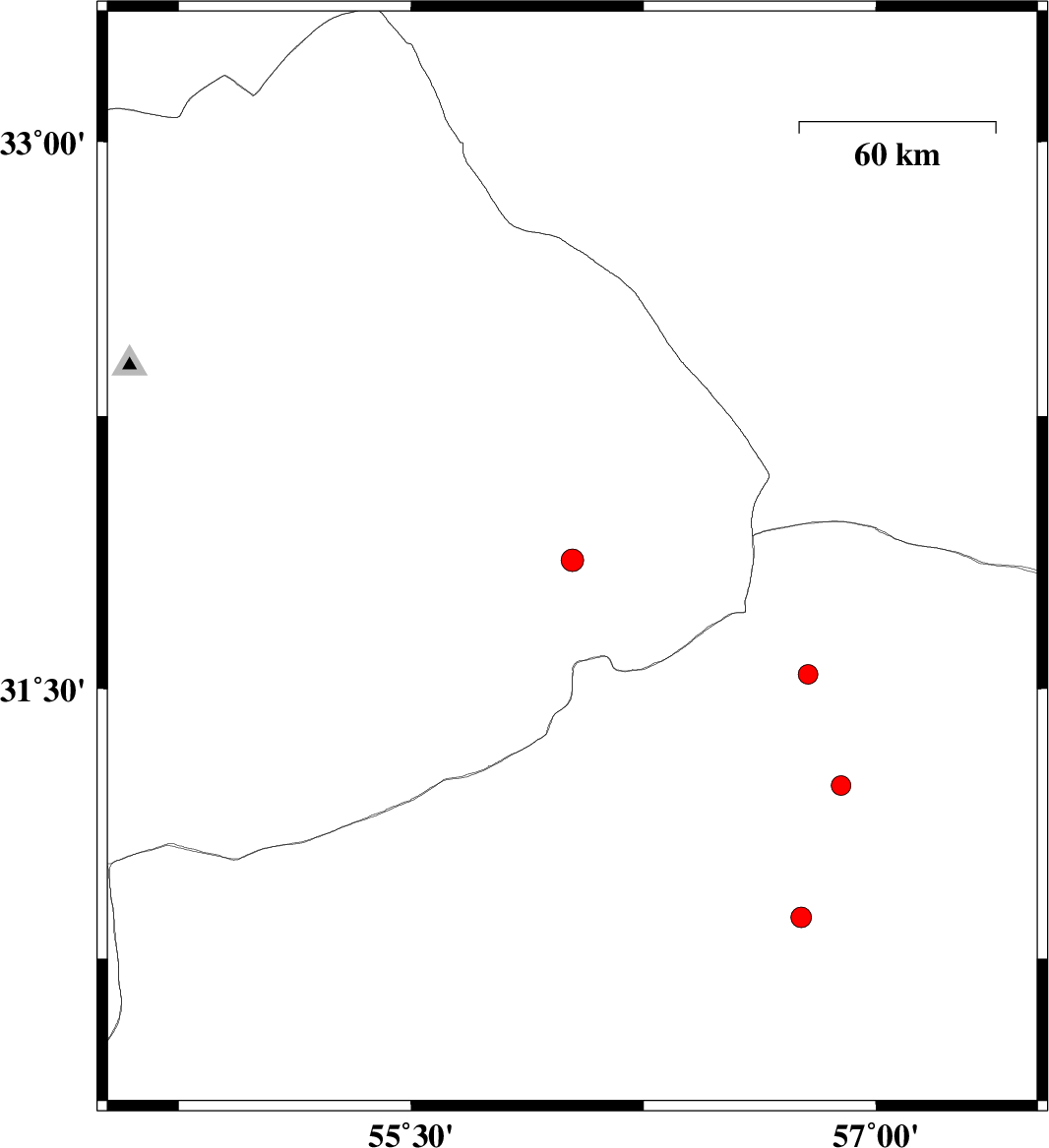| 2016/08/13 | 09:13:59.6 | 13:43:59.6 | 31.854 | 56.02 | 14 | ML3.2 | Yazd Province, 65 km North-East of Bafq | ||