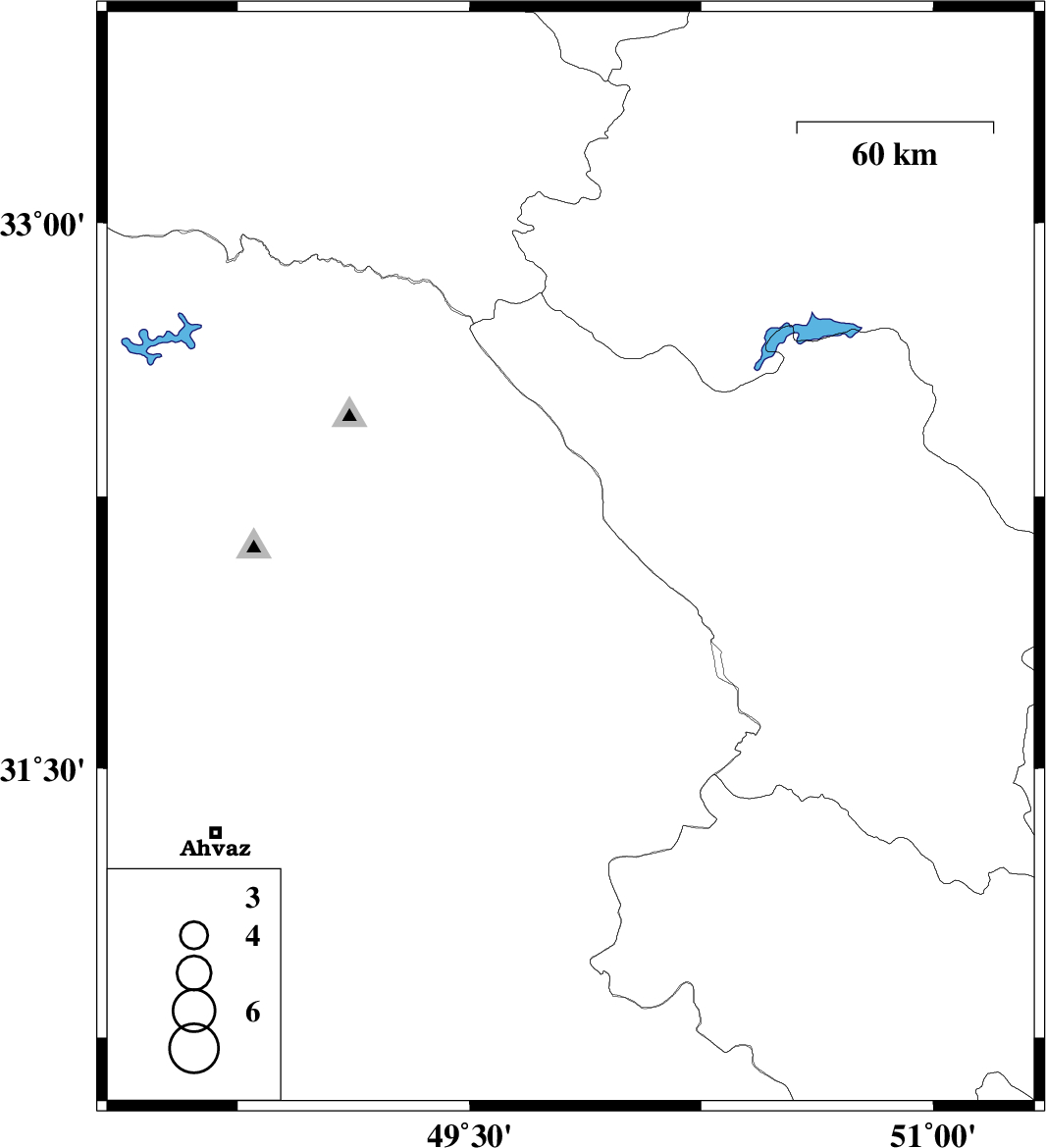 | 2016/08/16 | 06:44:13.9 | 11:14:13.9 | 32.074 | 49.827 | 14 | ML2.6 | Khoozestan Province, 27 km North of Izeh |