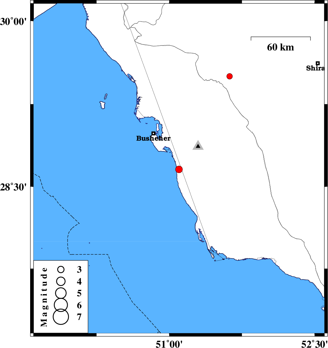 | 2016/08/15 | 00:58:00.3 | 05:28:00.3 | 29.501 | 51.622 | 6 | ML2.7 | Fars Province, 14 km South of Kazerun |