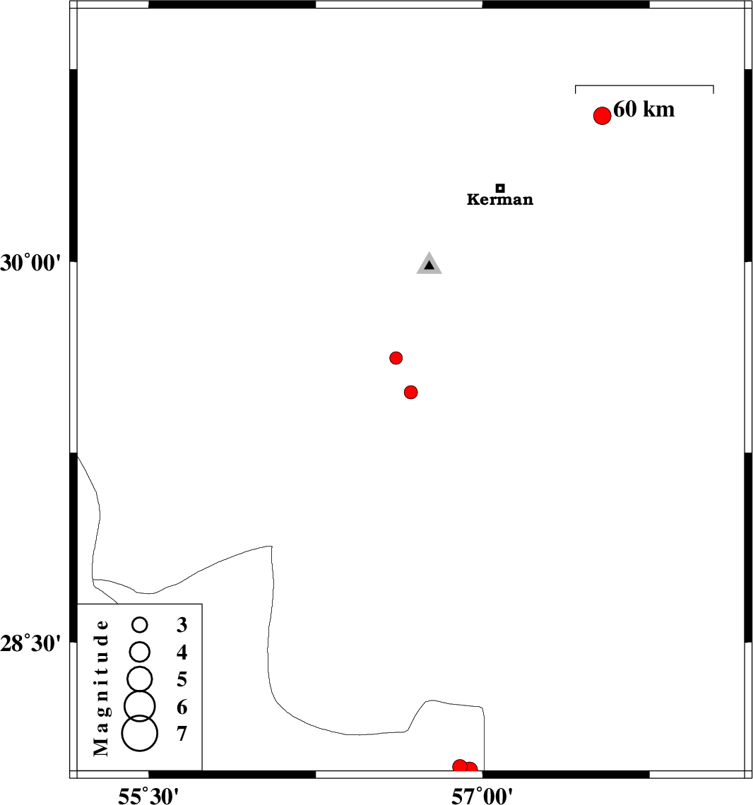 | 2016/09/06 | 22:07:47.1 | 02:37:47.1 | 29.623 | 56.61 | 15 | ML2.5 | Kerman Province, 34 km South of Bardsir | ||