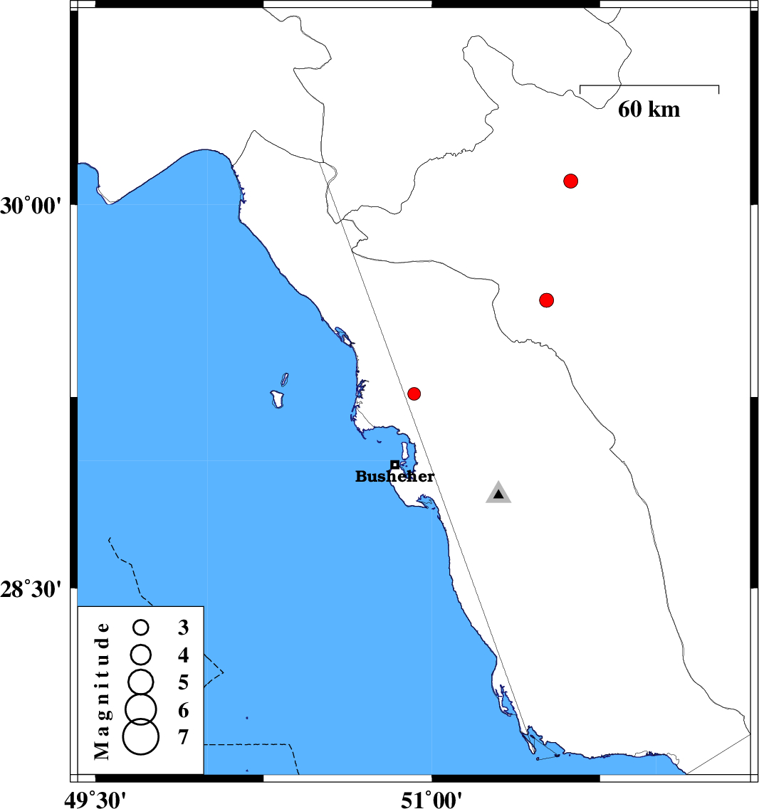 | 2016/09/09 | 06:38:22.9 | 11:08:22.9 | 29.262 | 50.921 | 11 | ML2.6 | Bushehr Province, 28 km -West of Borazjan | ||