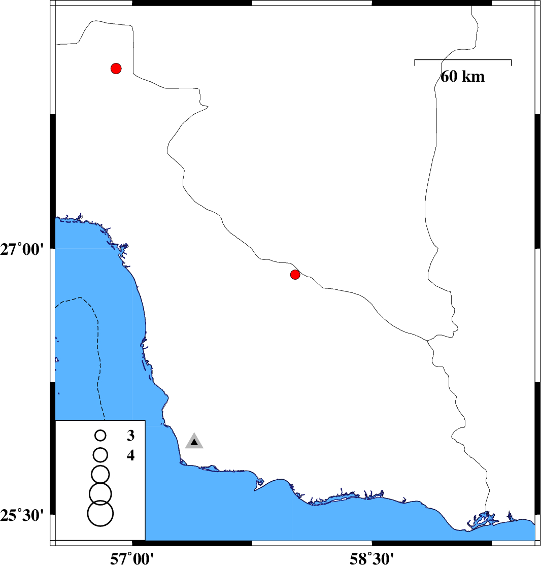 | 2016/09/03 | 00:09:29.1 | 04:39:29.1 | 28.004 | 56.898 | 15 | ML3 | Hormozgan Province, 78 km -West of Kahnuj |