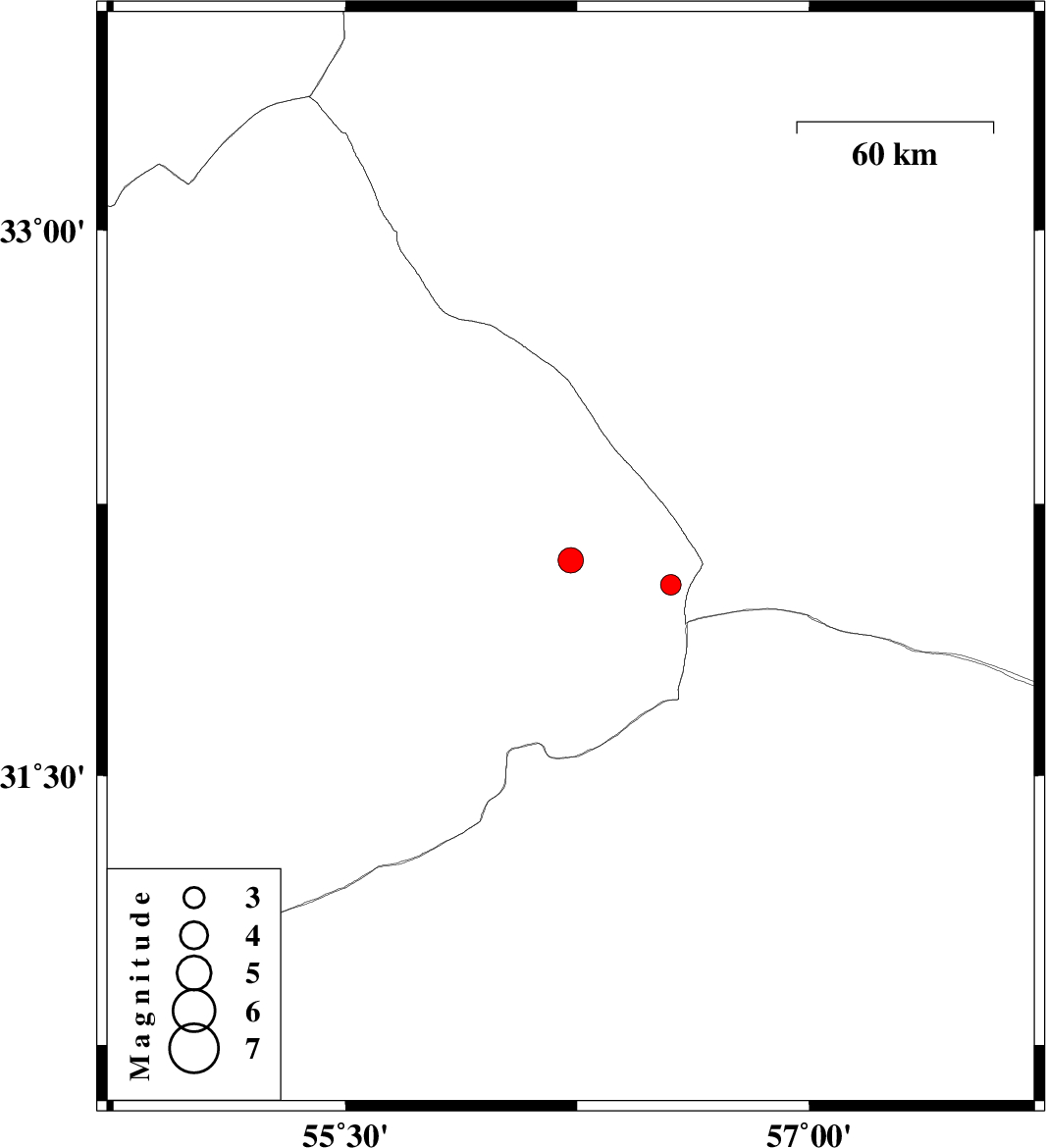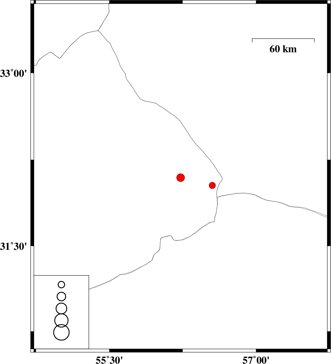 | 2016/09/10 | 18:03:42.1 | 22:33:42.1 | 32.095 | 56.229 | 14 | ML3.6 | Yazd Province, 96 km North-East of Bafq | ||
