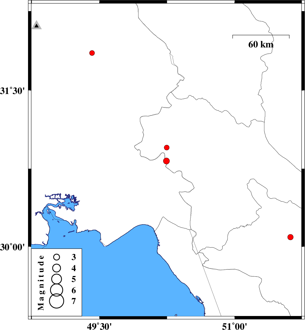 | 2016/09/05 | 02:04:40.1 | 06:34:40.1 | 30.091 | 51.62 | 14 | ML2.8 | Fars Province, 10 km of Nurabad | ||