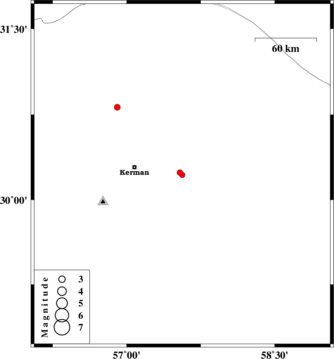 | 2016/09/18 | 11:25:57.6 | 15:55:57.6 | 30.24 | 57.54 | 14 | ML2.7 | Kerman Province, 45 km -East of Kerman | ||