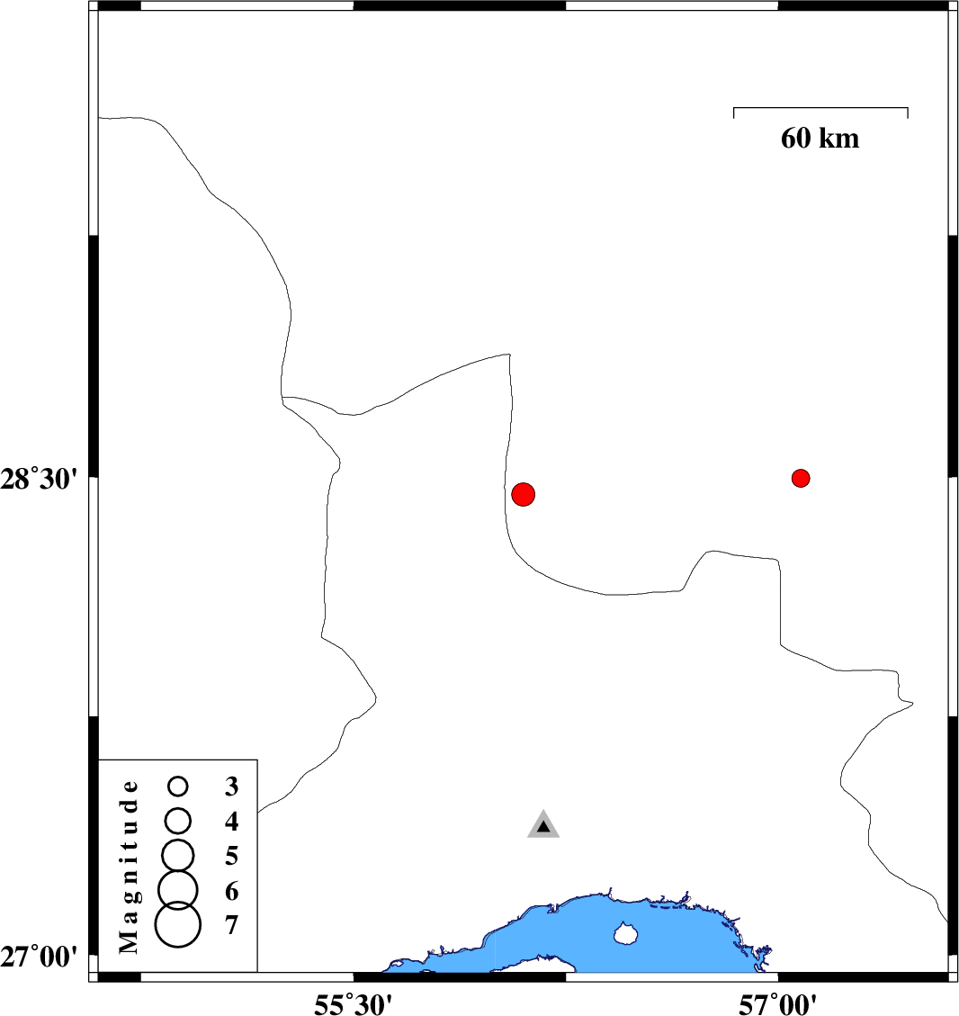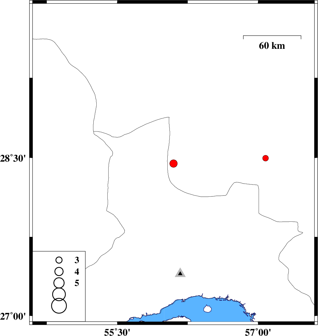 | 2016/09/25 | 20:37:59.7 | 00:07:59.7 | 28.444 | 56.099 | 15 | ML3.6 | Kerman Province, 24 km North-East of Hajiabad | ||