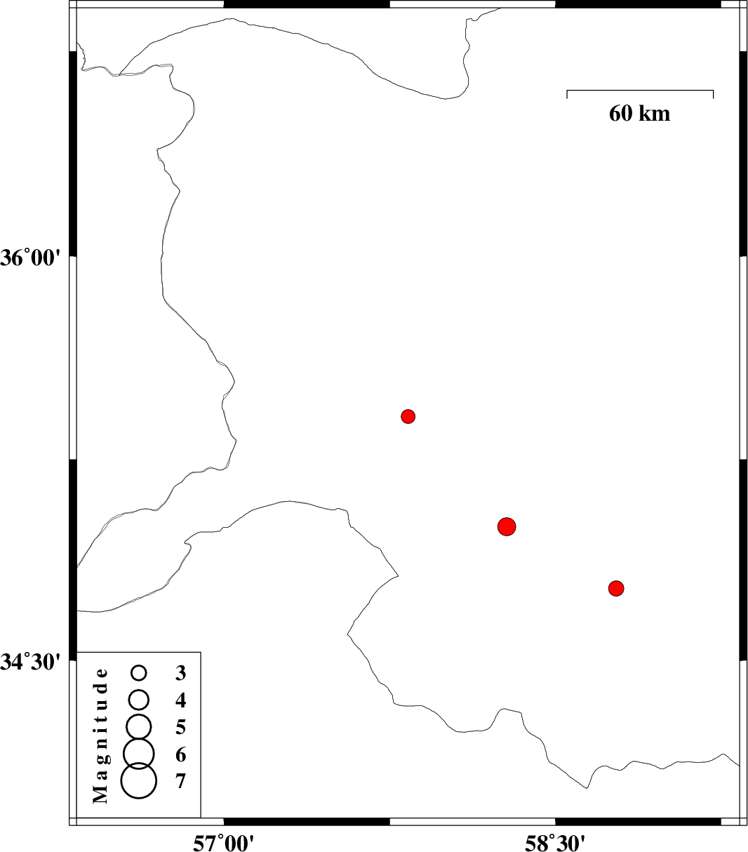 | 2016/09/07 | 22:05:41.8 | 02:35:41.8 | 34.999 | 58.279 | 17 | ML3.6 | Khorasan(center) Province, 31 km South-West of Kashmar |