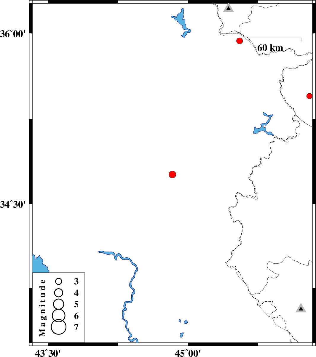 | 2016/10/15 | 14:43:32.8 | 18:13:32.8 | 35.932 | 45.552 | 14 | ML3 | Iraq, 26 km South of Sardasht | ||