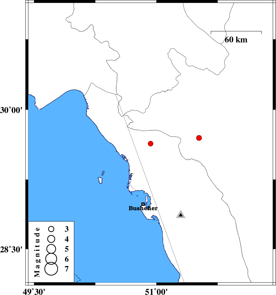 | 2016/10/21 | 05:19:06.1 | 08:49:06.1 | 29.697 | 51.522 | 15 | ML3 | Fars Province, 15 km -West of Kazerun |