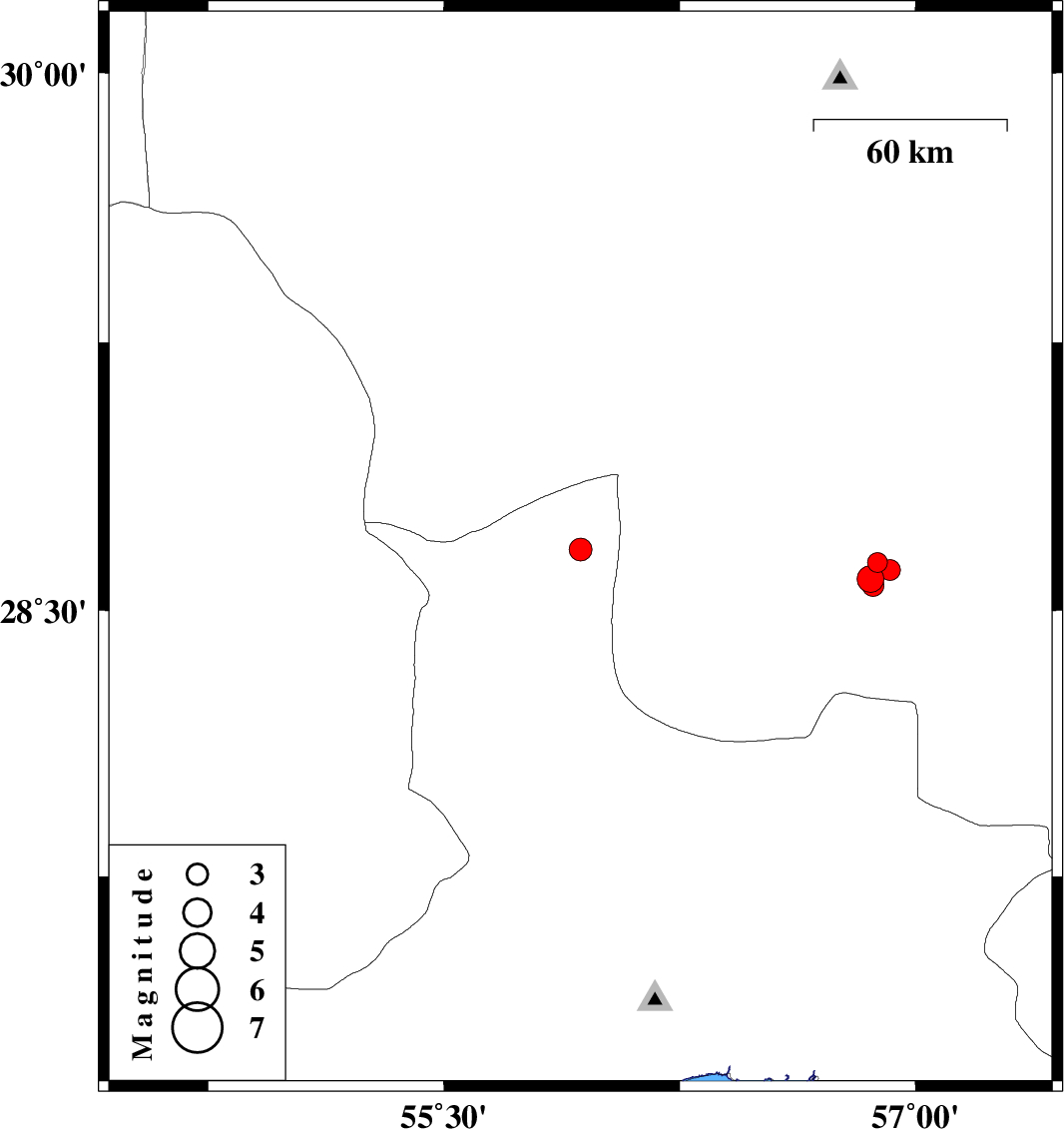 | 2016/10/22 | 05:46:49.8 | 09:16:49.8 | 28.614 | 56.918 | 14 | ML3 | Kerman Province, 80 km -West of Jiroft | ||