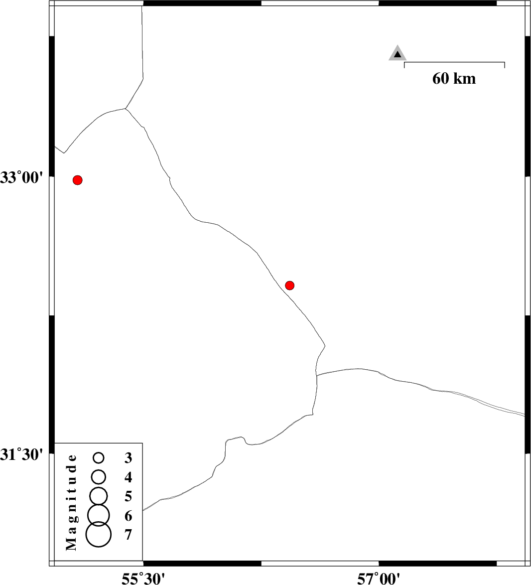 | 2016/10/31 | 09:06:33.6 | 12:36:33.6 | 32.98 | 55.078 | 11 | ML2.7 | Yazd Province, 156 km North-West of Bafq | ||
