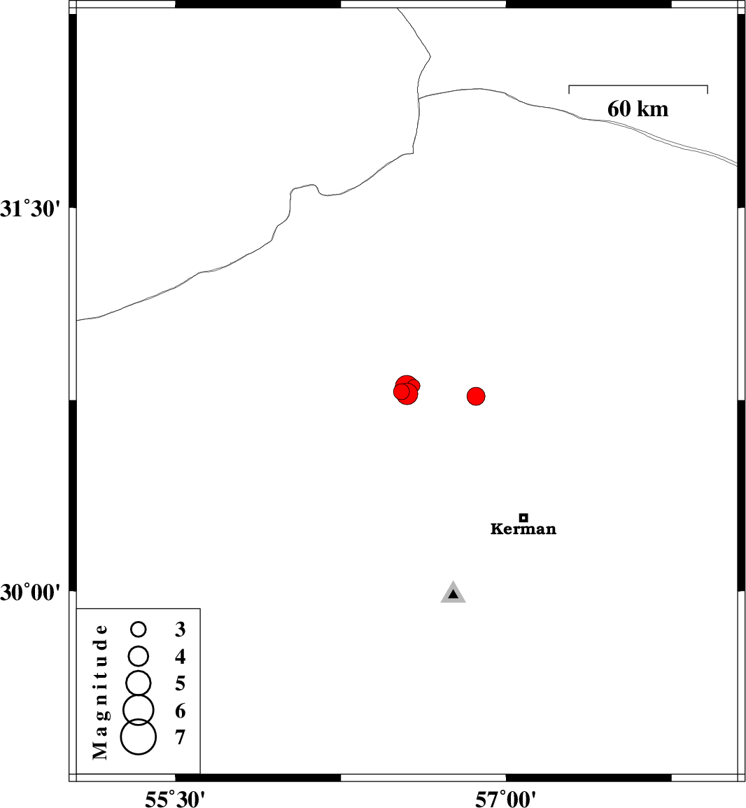 | 2016/10/31 | 14:44:39.1 | 18:14:39.1 | 30.783 | 56.524 | 9 | ML3.3 | Kerman Province, 5 km of Zarand | ||