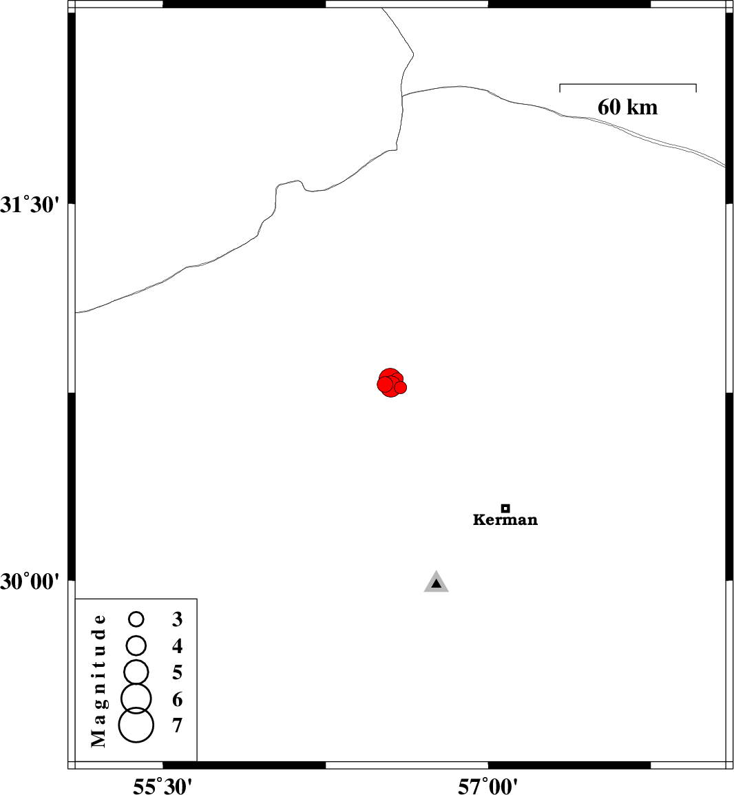 | 2016/10/31 | 14:44:39.1 | 18:14:39.1 | 30.783 | 56.524 | 9 | ML3.3 | Kerman Province, 5 km of Zarand | ||