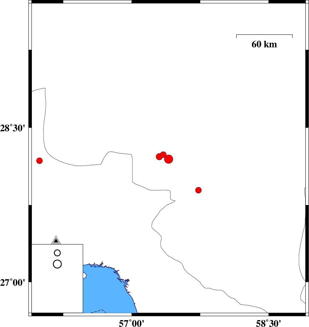 | 2016/11/09 | 01:15:22.5 | 04:45:22.5 | 28.196 | 57.404 | 15 | ML4.2 | Kerman Province, 39 km North-West of Kahnuj | ||