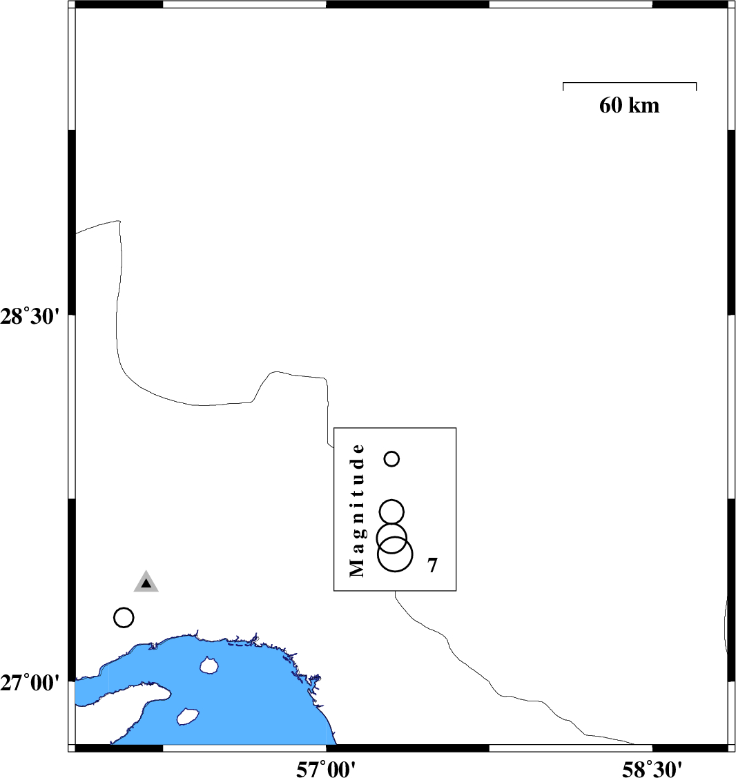 | 2016/11/09 | 01:15:22.5 | 04:45:22.5 | 28.196 | 57.404 | 15 | ML4.2 | Kerman Province, 39 km North-West of Kahnuj | ||
