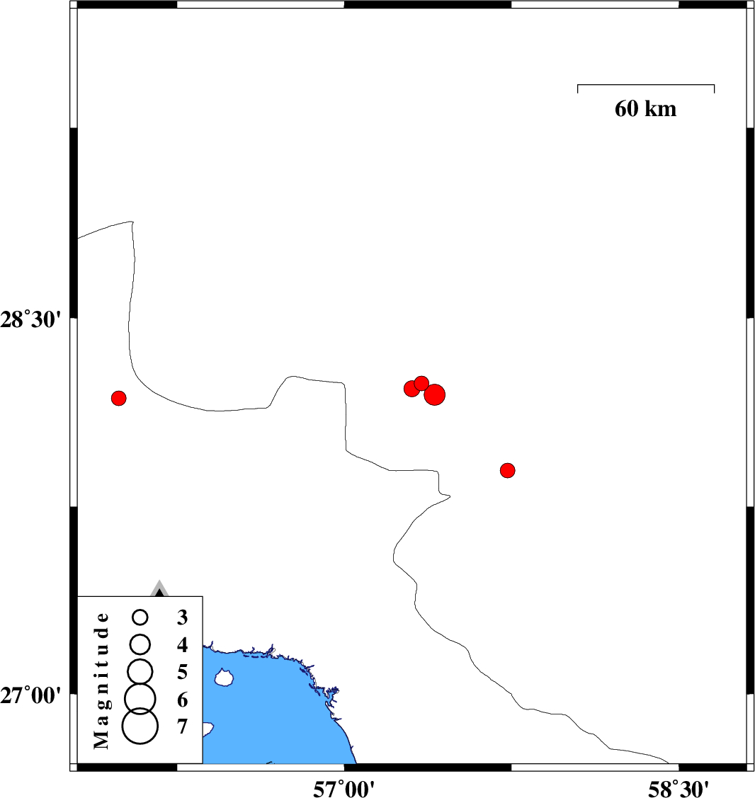 | 2016/11/09 | 01:15:22.5 | 04:45:22.5 | 28.196 | 57.404 | 15 | ML4.2 | Kerman Province, 39 km North-West of Kahnuj | ||