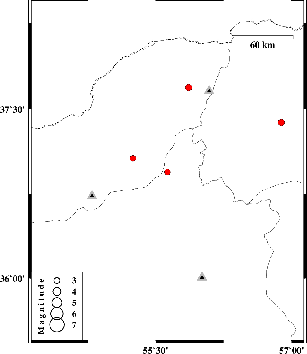 | 2016/11/05 | 18:32:34.1 | 22:02:34.1 | 37.689 | 55.864 | 7 | ML3.2 | Golestan Province, 48 km North-East of Kalaleh |