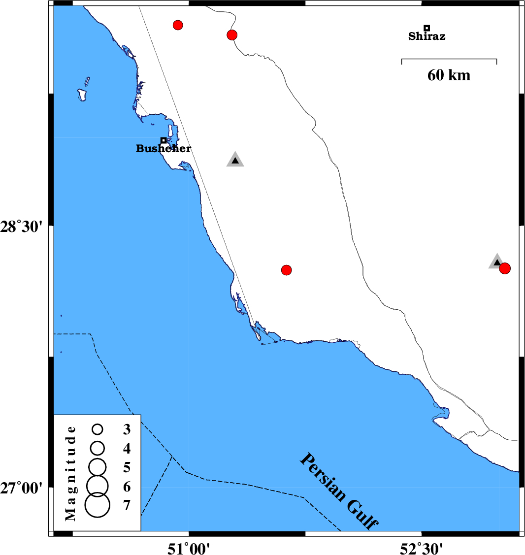 | 2016/11/17 | 21:27:49.3 | 00:57:49.3 | 29.581 | 51.278 | 6 | ML2.9 | Bushehr Province, 36 km North of Borazjan | ||