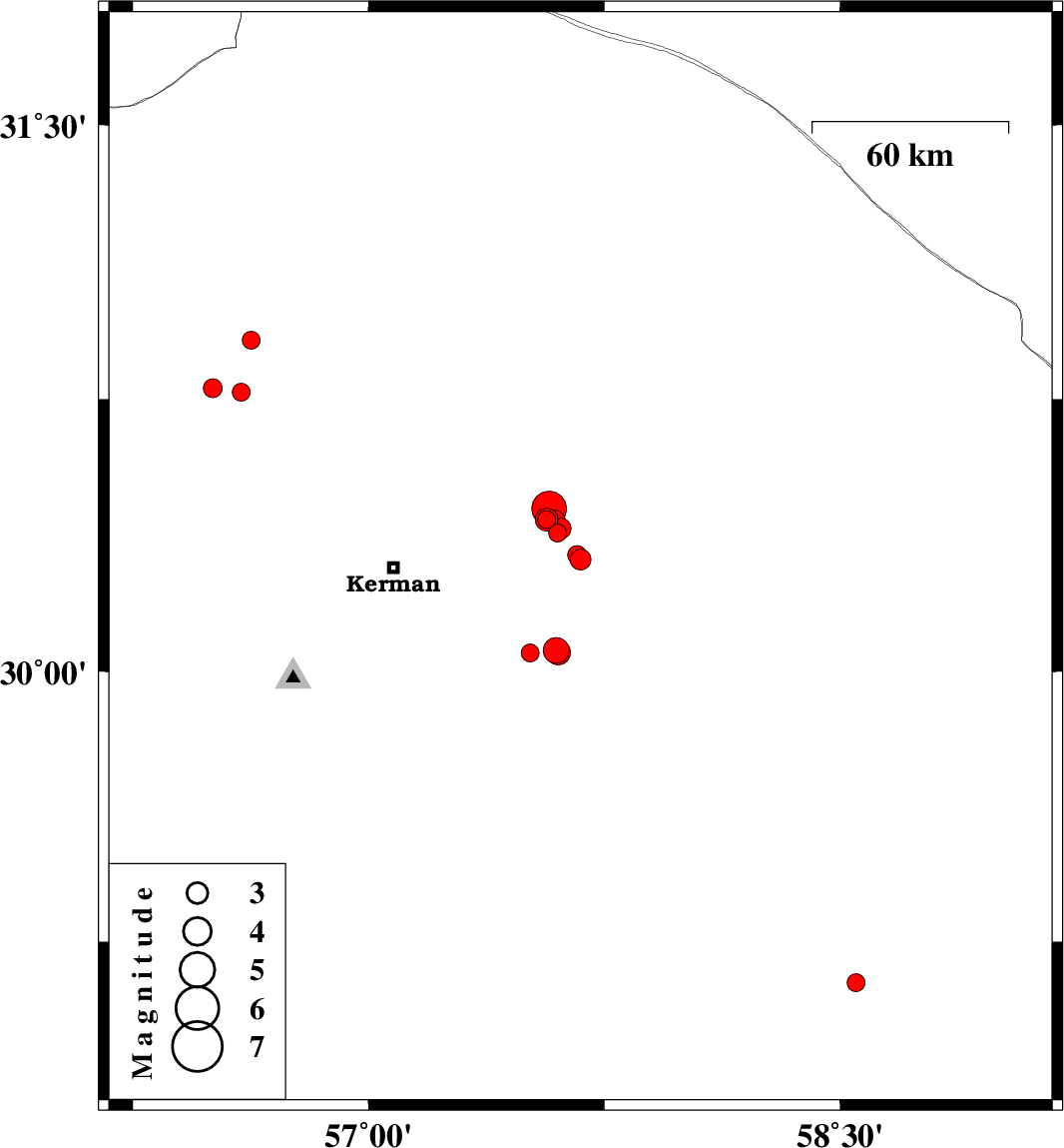 2016/11/10 15:20:09.5 18:50:09.5 30.05857.5977 ML3.6 Kerman Province, 56 km South-East of Kerman