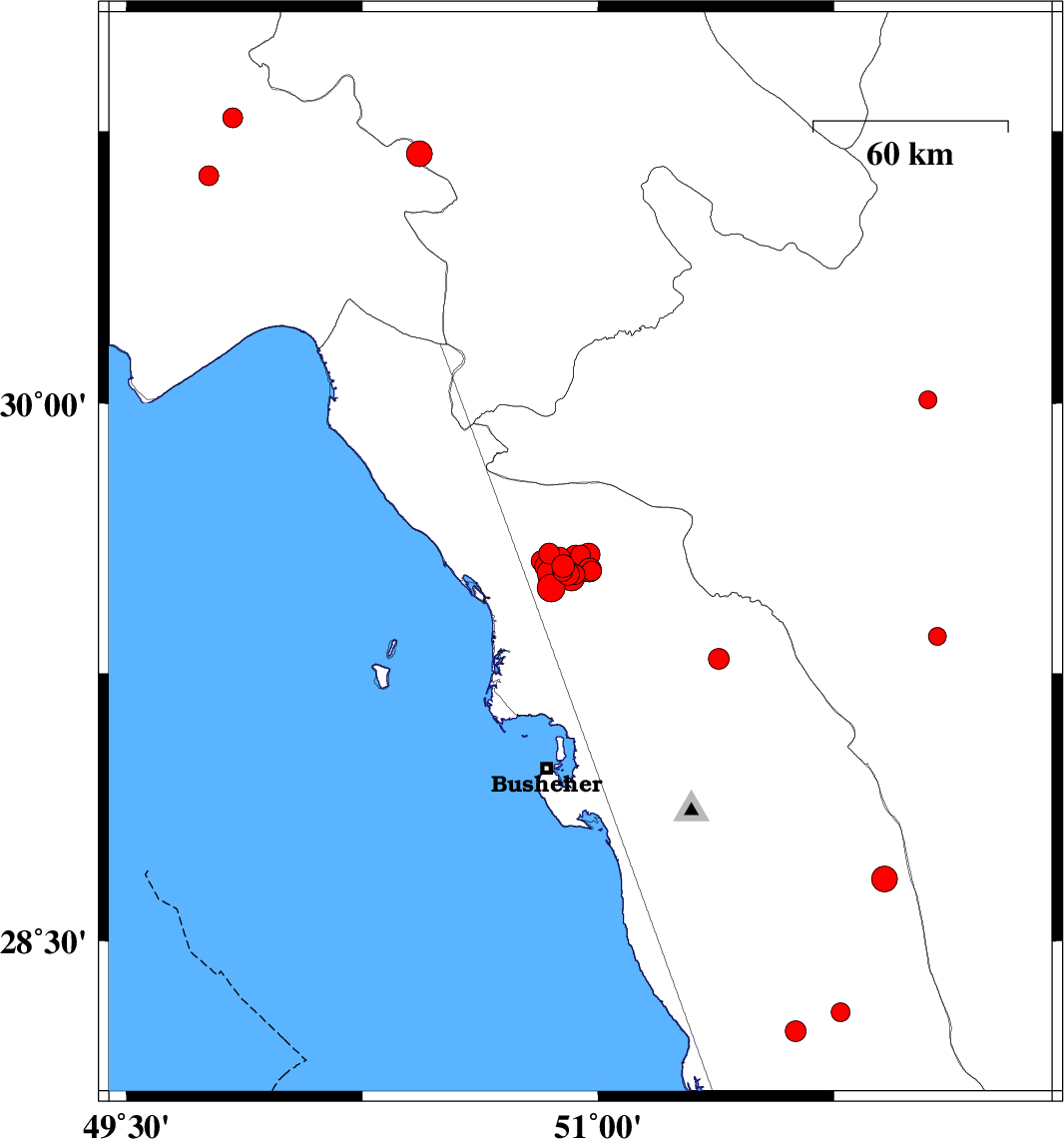 2016/12/18 21:29:10.7 00:59:10.7 29.52550.92615 ML2.8 Bushehr Province, 40 km -East of Bandar-e genaveh
