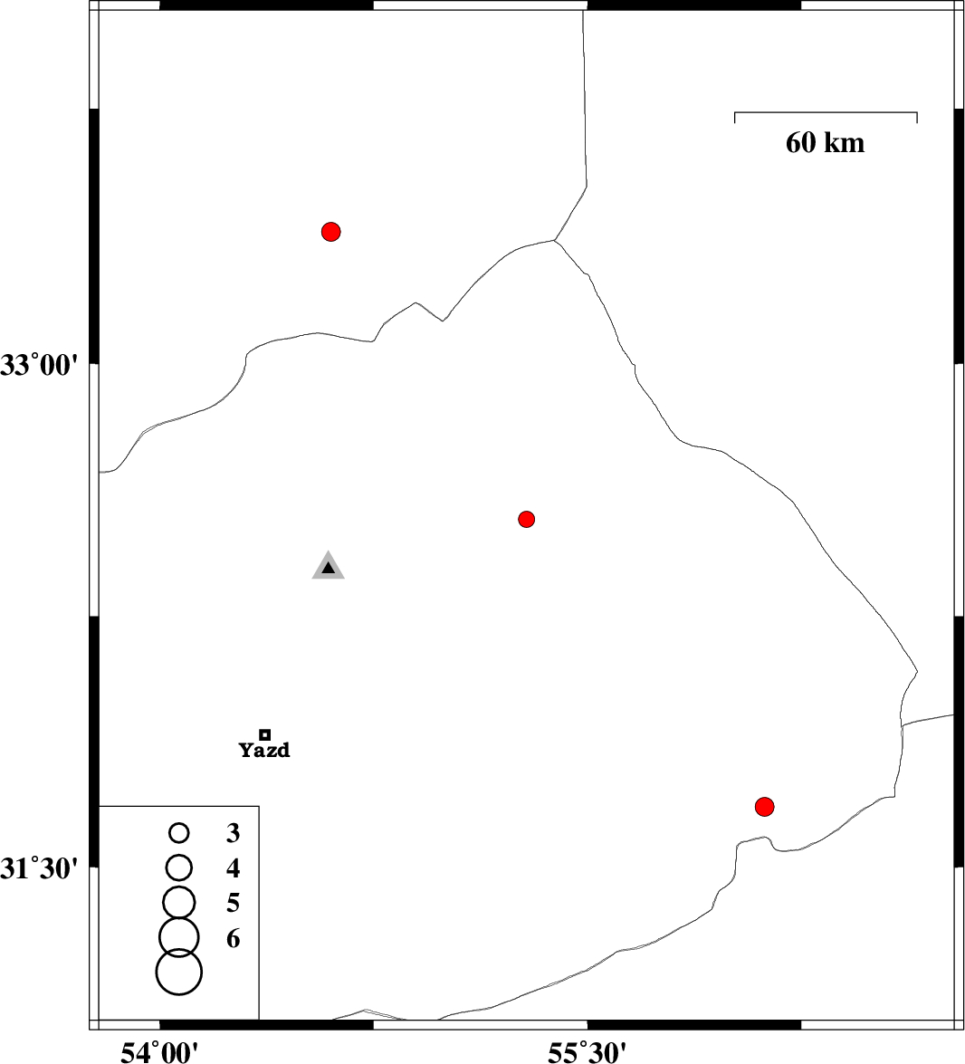| 2016/12/12 | 01:45:44.2 | 05:15:44.2 | 31.681 | 56.121 | 14 | ML2.9 | Yazd Province, 69 km -East of Bafq | ||